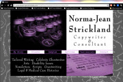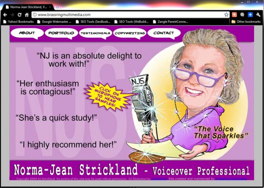 Web design for Norma-Jean Strickland, voice-over artist. “NJ” brought me a caricature drawn by artist Joe Schmidt, and wished it to feature prominently in her website design. Home page navigation features comic-book style “word bubbles” and a dynamic “burst” on the vintage microphone calls up a pop-window with voice samples.