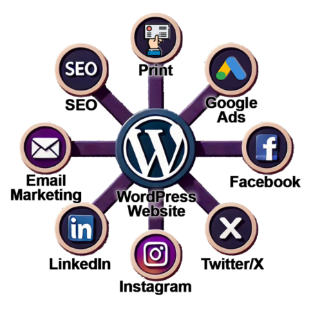 At Brass Ring, we use our Hub & Traffic Spokes Model to create a powerful digital marketing strategy. Your WordPress website becomes the hub, with traffic being driven to it through SEO, social media, email marketing, and online ads. This model ensures you’re not just building a website—you’re building a comprehensive marketing ecosystem that supports your small business launch.