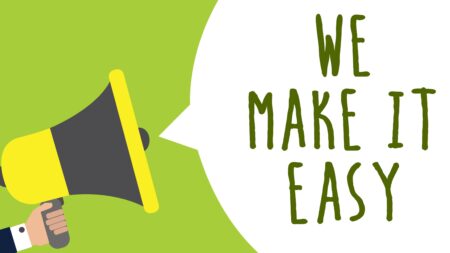 Hand w bullhorn shouting "We Make It Easy" (illustration)