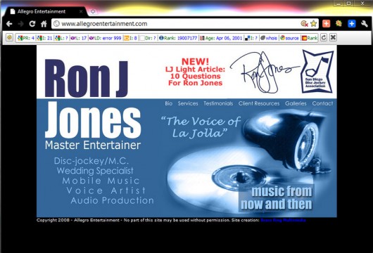 One of the great things about being me is that I specialize in serving the community of La Jolla, California where I grew up.  As such, I get to work with my friends and neighbors. One such friend is Mr. “Ron J” Jones, popular and very active La Jolla community members. Ron is a long-time dear friend and I enjoyed the opportunity to help him present his company, Allegro Entertainment and himself online. Though Ron’s “CD-trola” (my term) design was already created before I entered the project, it became my task to create a web design around that focal point.